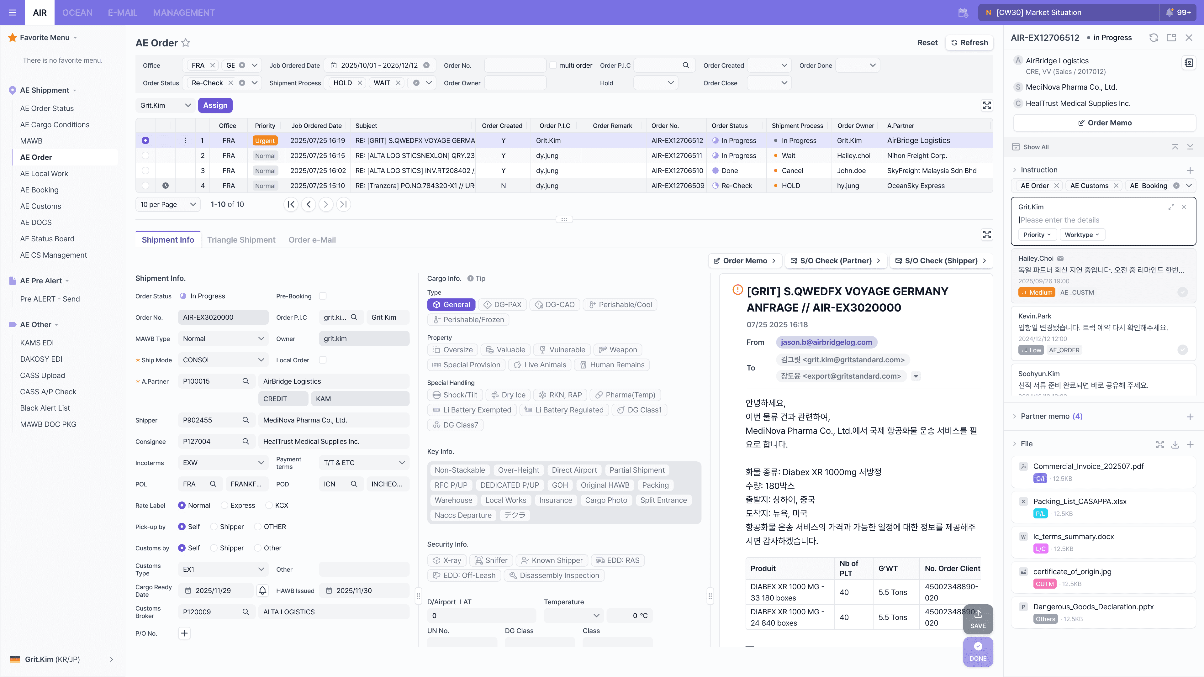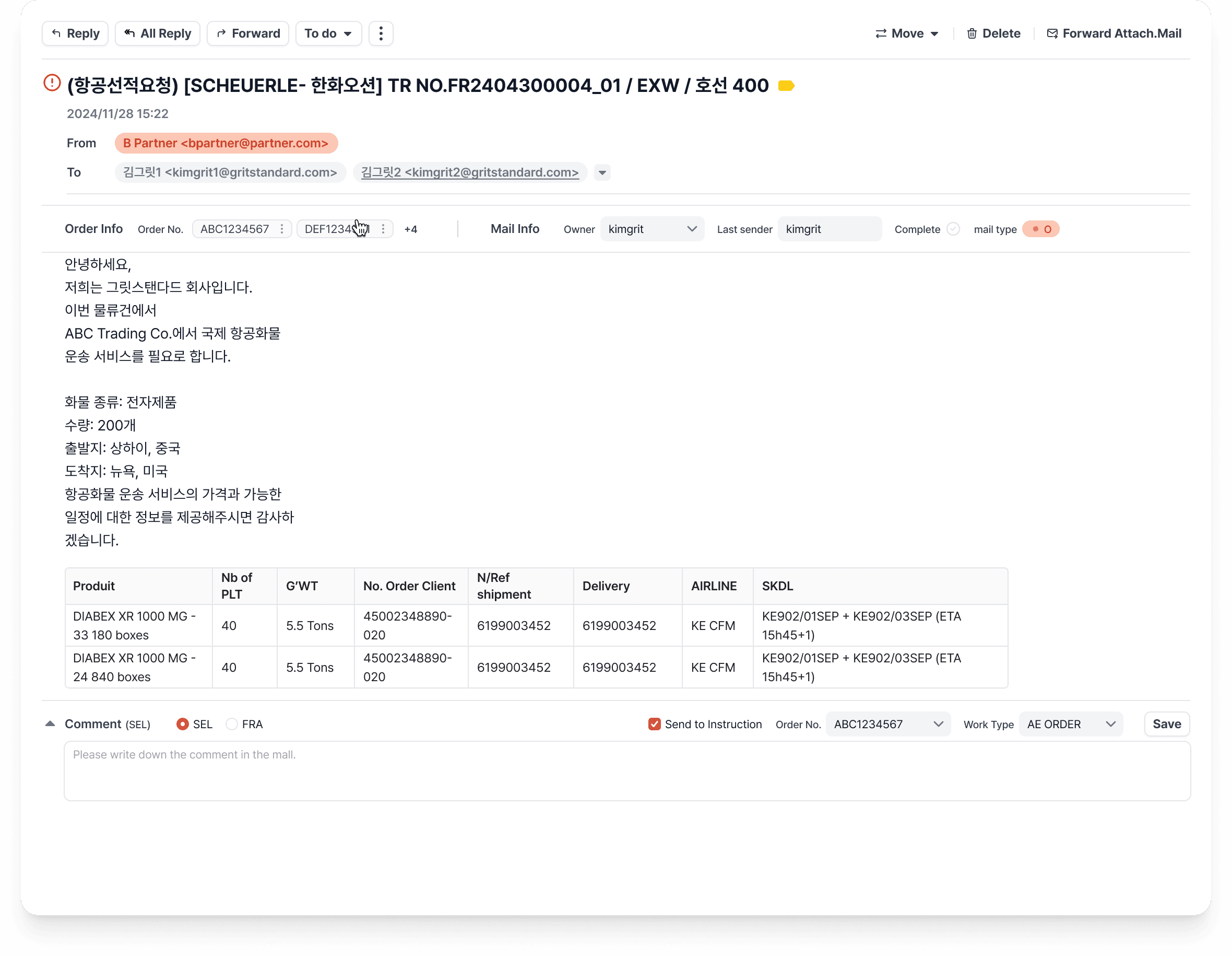 ABC Trading Co. 건으로 신규 항공 오더를 받아 메일드립니다.
